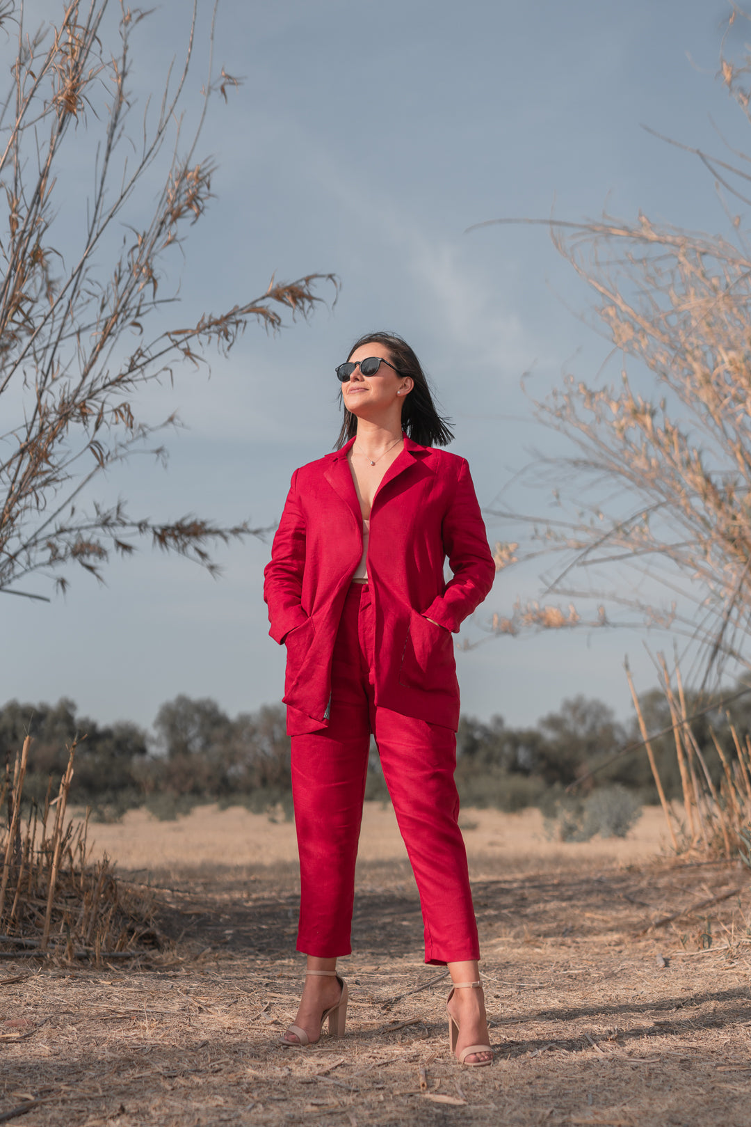 Introducing our 'Cardo Linen Suit', featuring a tailored "blazer" adorned with pockets and lined with a stylish printed interior. Accompanied by ankle-length trousers, meticulously crafted with front darts and a rear elastic waistband for comfort. Complete with side pockets, both pieces are fashioned from luxurious linen fabric, epitomizing sophistication and refinement.